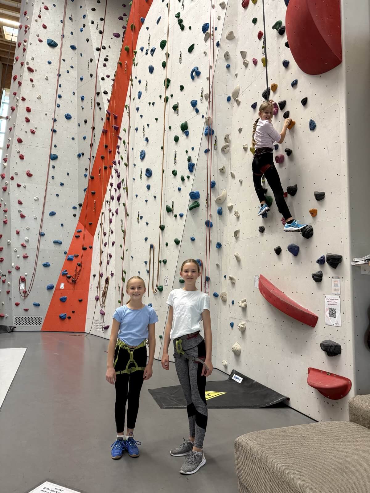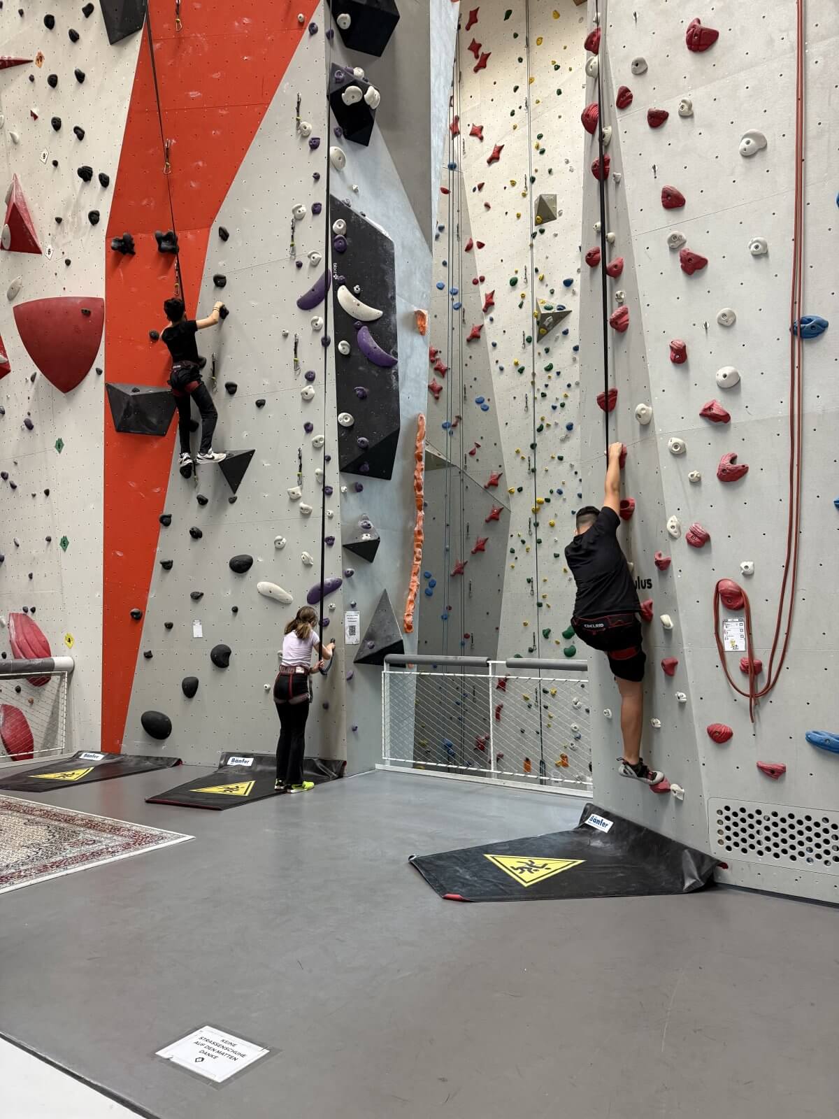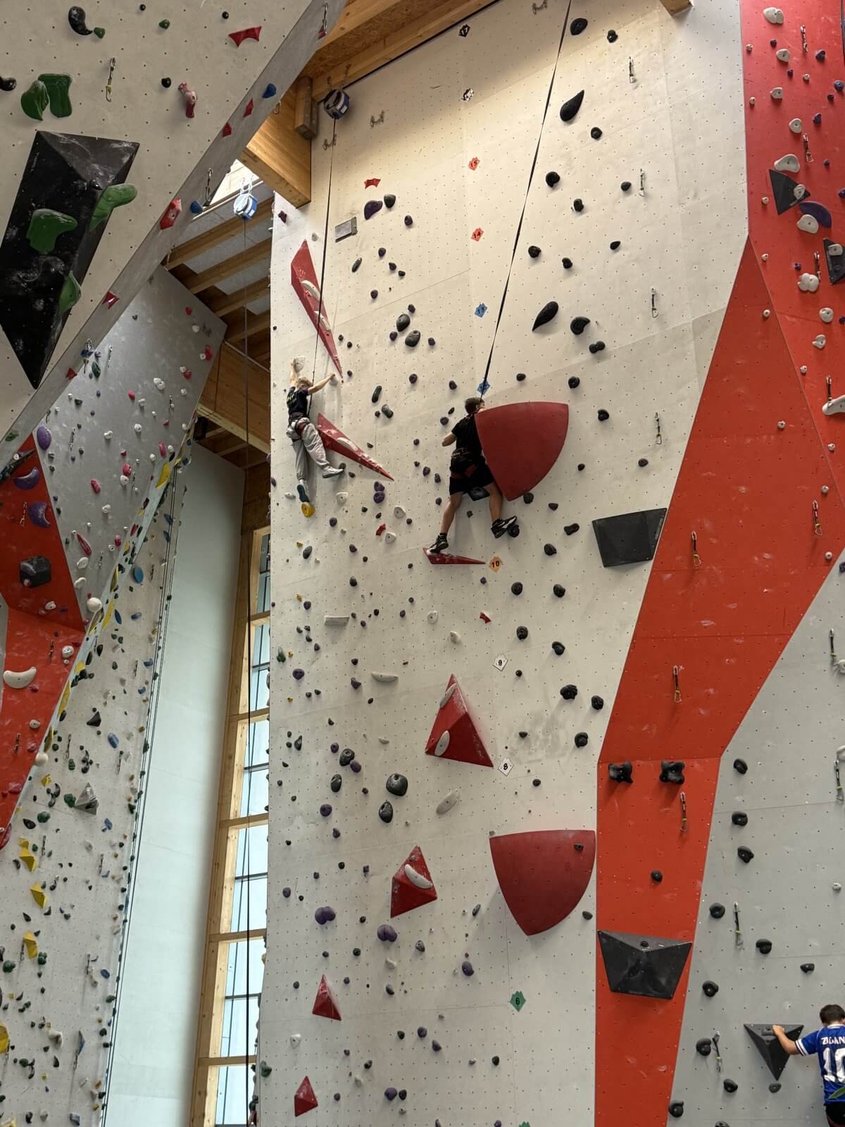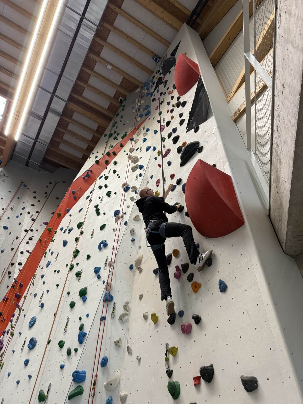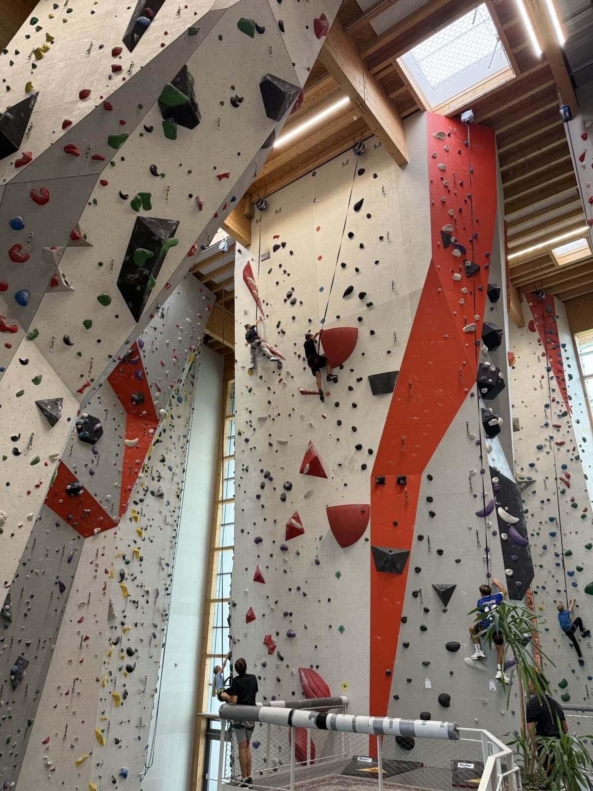In der Kletterhalle angekommen, haben wir eine Einführung von einem Kletterprofi bekommen und durften im Boulderbereich unsere ersten Erfahrungen sammeln. Dann ging es auch schon weiter zur Kletterwand. Dort erhielten wir von einem weiteren Mitarbeiter eine Einführung für die große Kletterwand. Anschließend wurden die Gurte angelegt, und es ging los. Die Kletterwände waren bis zu 18 Meter hoch und hatten verschiedene Schwierigkeitsgrade.