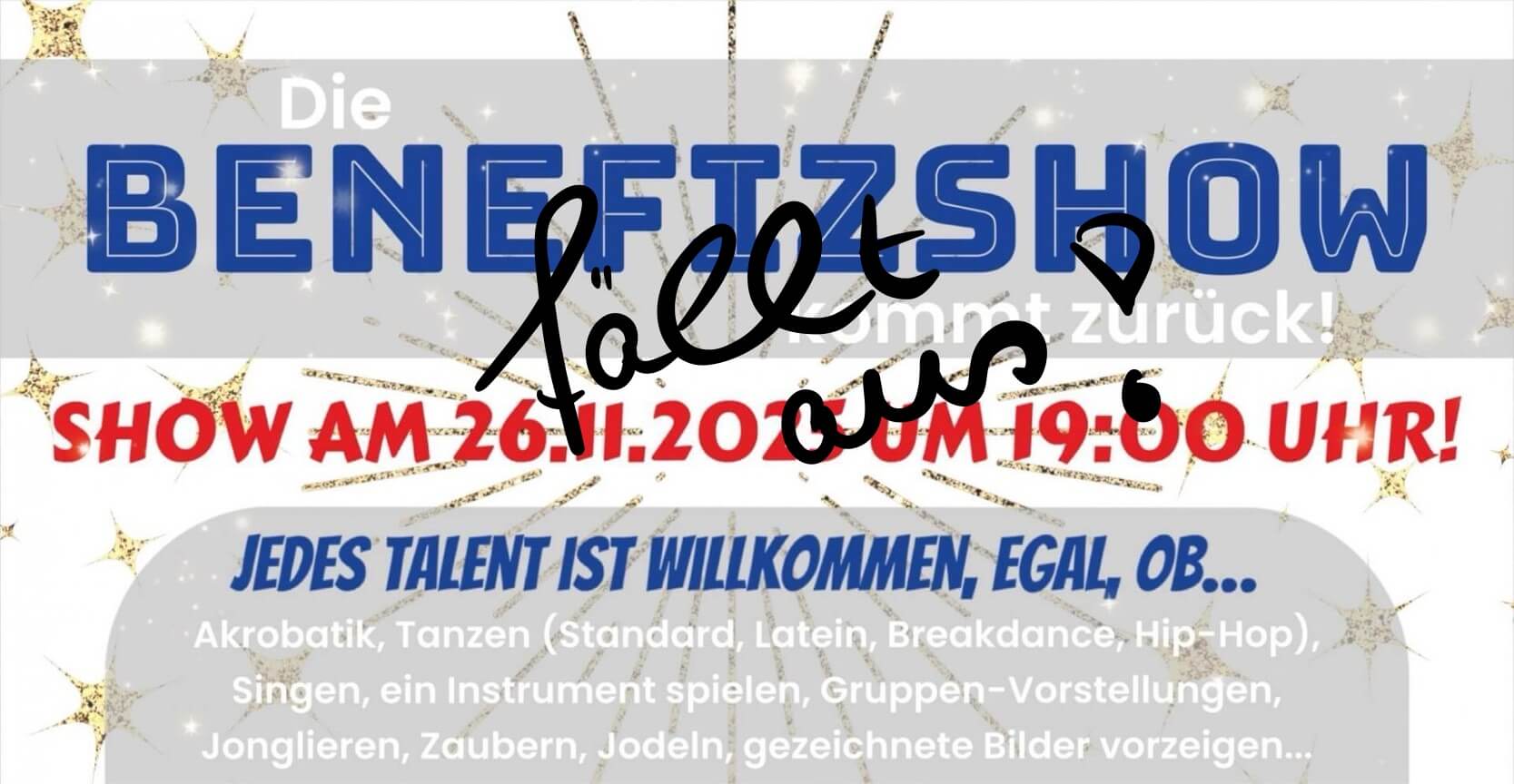 Leider muss die Benefizshow am Mittwoch, den 26.11. aufgrund von zu wenigen Anmeldungen abgesagt werden.