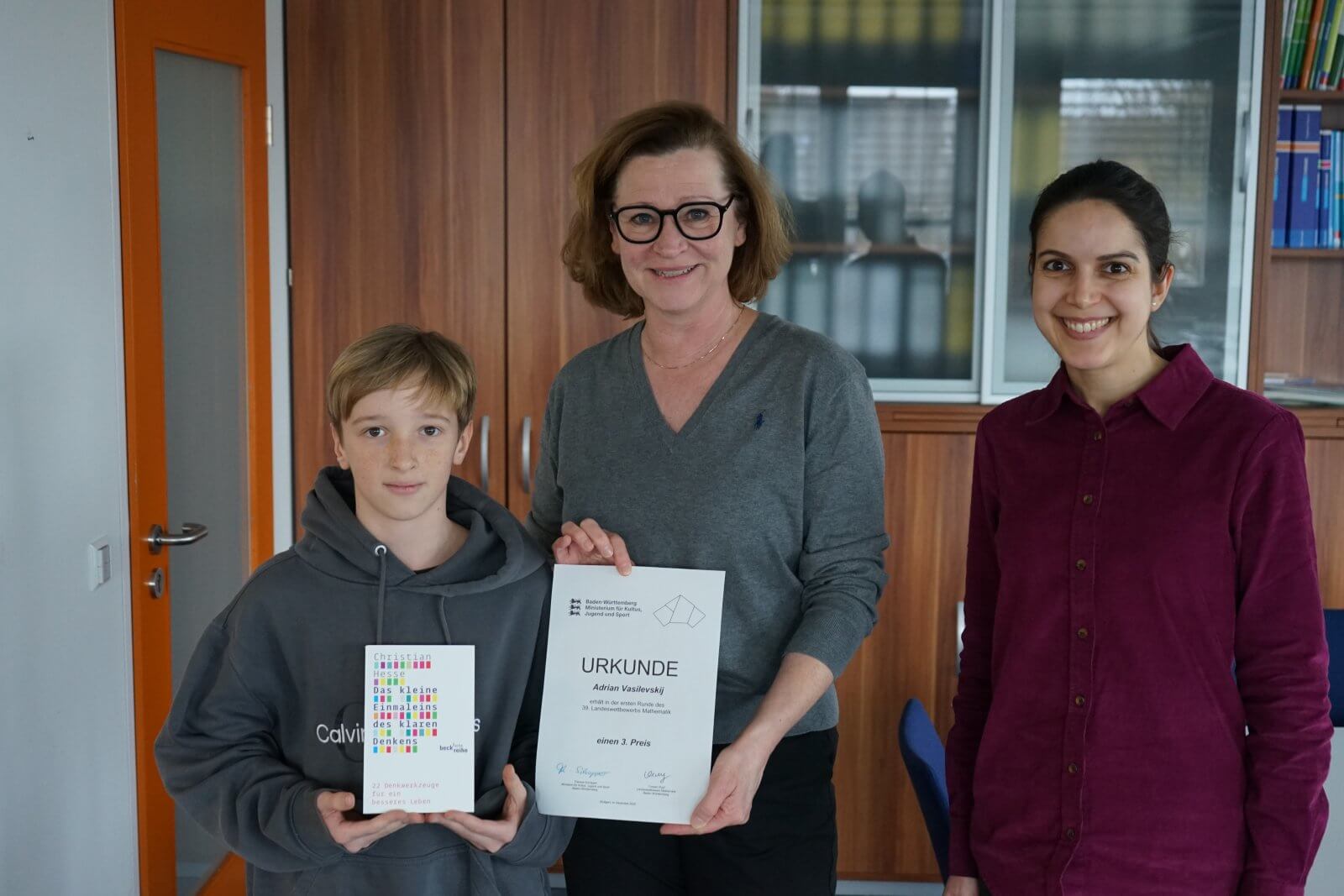 Mit Freude und Stolz gratulieren wir unserem Schüler Adrian Vasilevskij aus der Klasse 6a zu seinem Erfolg beim Landeswettbewerb Mathematik. Schon seit 1987 findet dieser Wettbewerb jährlich in Baden-Württemberg statt und richtet sich an Schülerinnen und Schüler der Klassen 5-10, die ihre mathematische Begabung testen und weiterentwickeln möchten. Adrian hat zum ersten Mal teilgenommen und einen dritten Preis erhalten. Dafür bekam er von unserer Schulleiterin Susanne Schwahn und seiner Mathelehrerin Hanna Krämer eine Urkunde sowie einen Buchpreis überreicht. Wir sind schon gespannt auf Adrians Ergebnisse bei zukünftigen Mathematikwettbewerben!