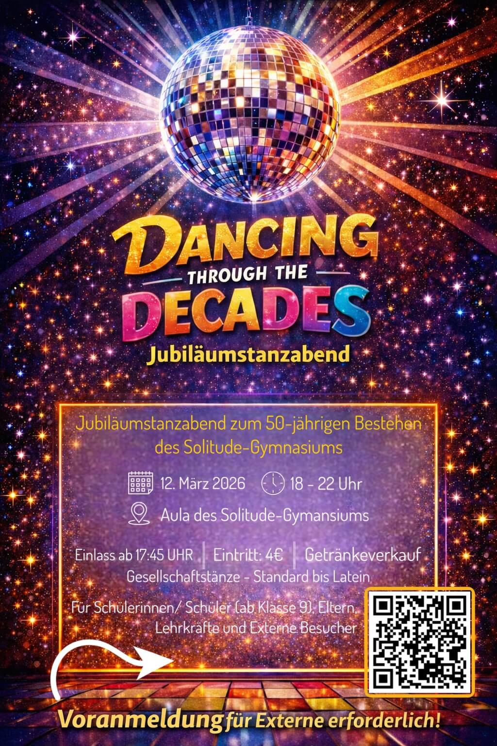 Anlässlich des 50-jährigen Jubiläums lädt das Solitude-Gymnasium am Donnerstag, den 12. März, von 18 bis 22 Uhr zum Jubiläumstanzabend „Dancing through the Decades“ in die Aula des des Solitude-Gymnasiums ein.