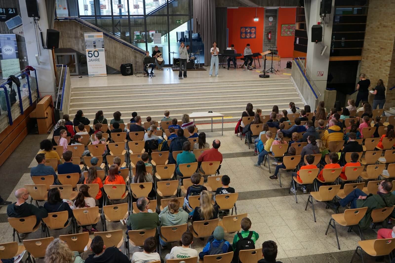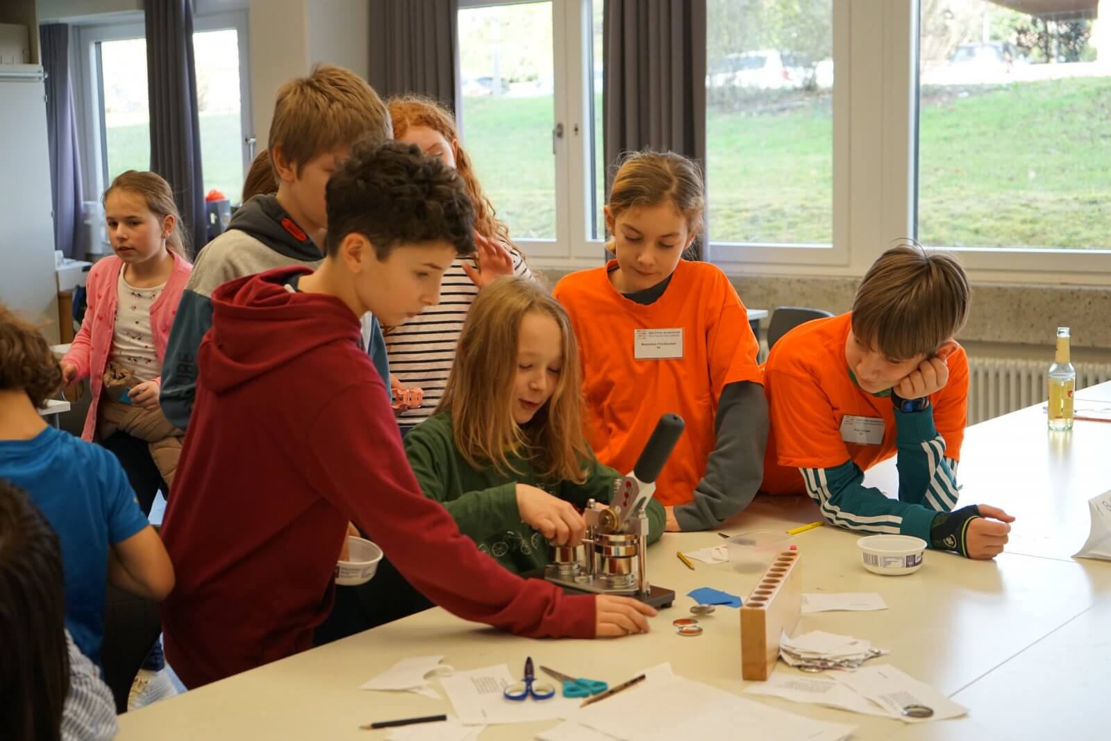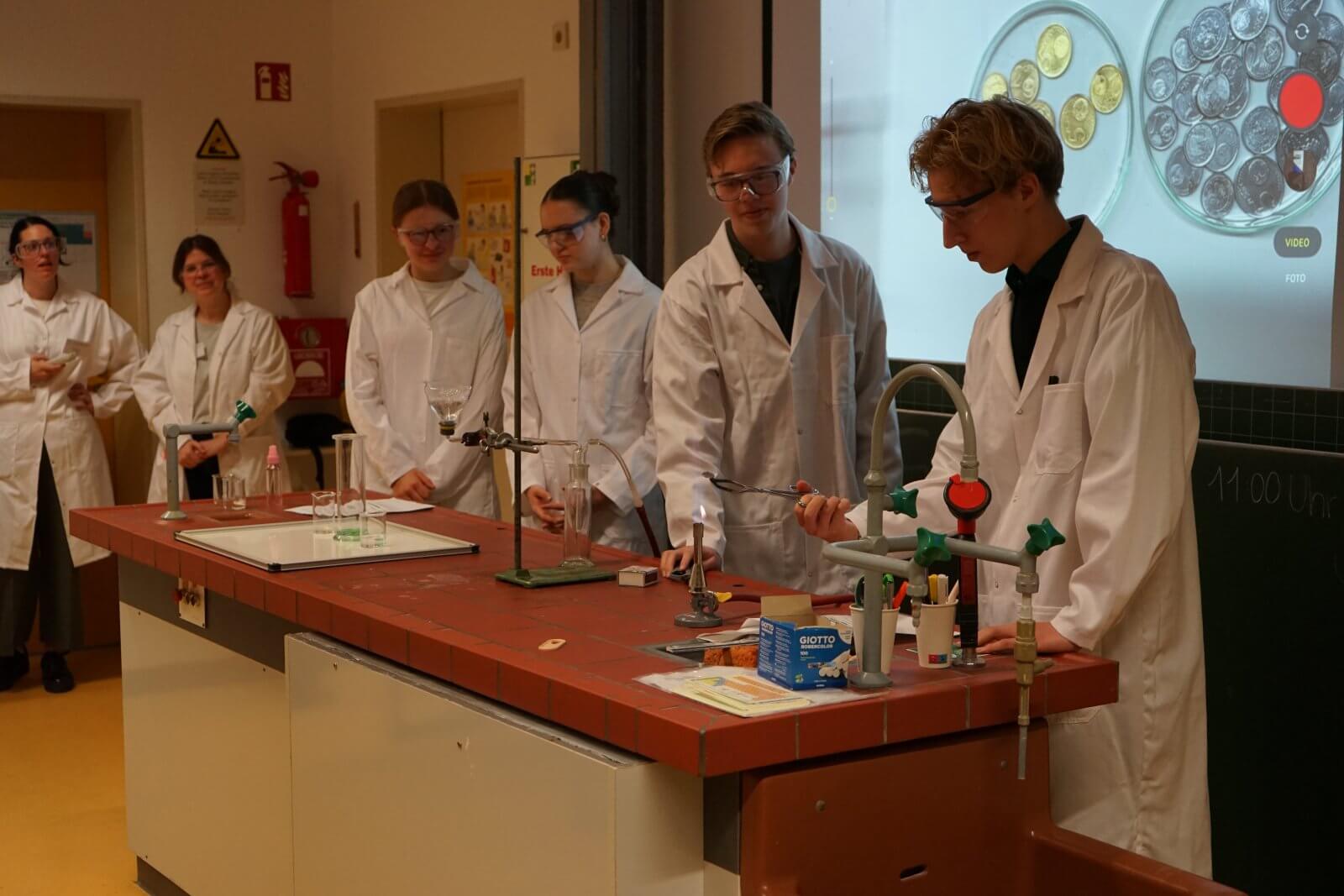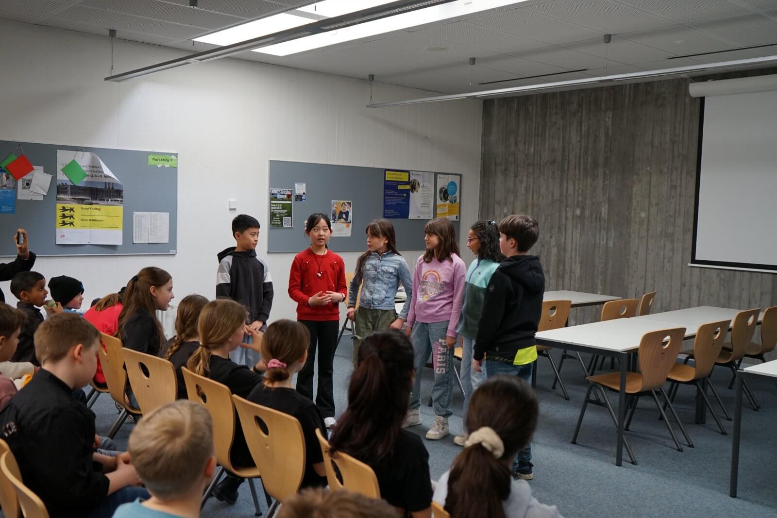 Nach einer ansprechenden Begrüßung durch die Schulband mit „Tau mich auf“ und einem kurzen, informativen Vortrag der Schulleiterin Frau Schwahn begaben sich kleine und große Besucherinnen und Besucher auf Erkundungstour durch das Schulhaus. Es erwarteten sie dort abwechslungsreiche und unterhaltsame Mitmach-und Informationsangebote, präsentiert und entwickelt von zahlreichen engagierten Schülerinnen und Schülern und ihren Lehrerinnen und Lehrern: Im Naturwissenschaftsstrakt konnte man staunend in die „Welt der Physik“ eintauchen, Laubstreu mit dem Binokular untersuchen oder eine beeindruckende feurig-märchenhafte Chemie-Show erleben; in der gemütlich eingerichteten Schulbibliothek waren sprachdetektivische Fähigkeiten gefragt, derweil die Italienischfachschaft mit Eis und Espresso und die Französischfachschaft mit frisch gebackenen Crepes lockte; mathematische Knobeleien sowie spannende Quizaufgaben zu Frankreich, England, Italien und zum alten Rom bereiteten großen Spaß, ebenso das Basteln eines Globus‘, das Balancieren am „heißen Draht“ oder Rollenspiele in der Verkleidung eines römischen Gladiators. Begeisterten Applaus ernteten die Kinder des bilingualen Zugs der 5a, die in beeindruckend flüssigem Englisch drei witzige Theaterstücke zur Aufführung brachten. Wer wollte, konnte sich von freundlichen Schülerlotsen durchs Schulhaus führen lassen oder den Eltern der Schule Fragen stellen und ehrliche Antworten bekommen. Die Eltern der Klassen 6 hatten leckere Kuchen gebacken und Kaffee gekocht und luden damit zum Verweilen ein.