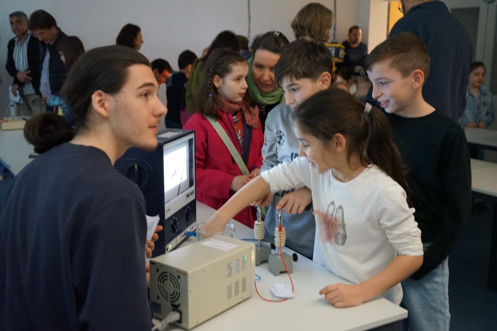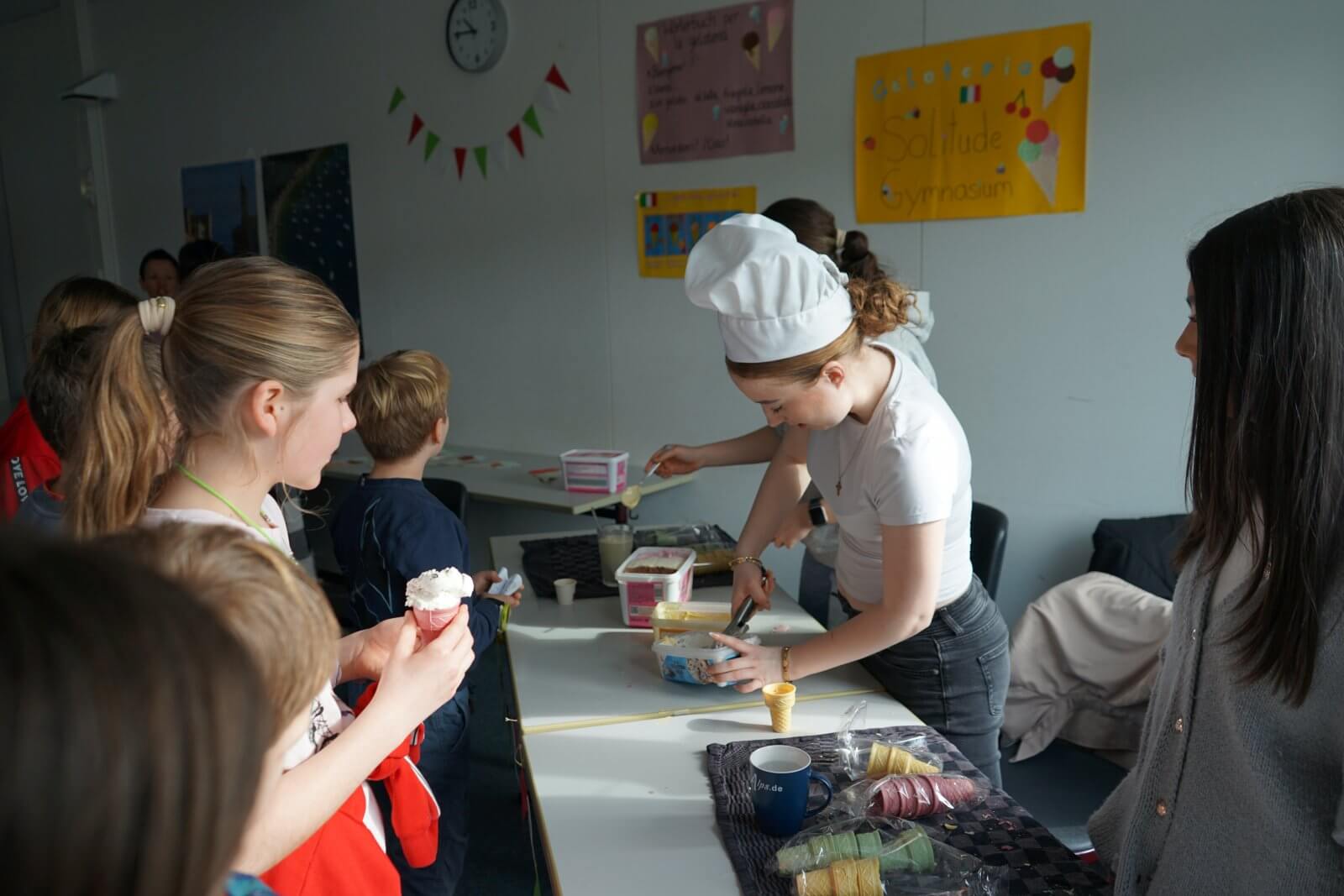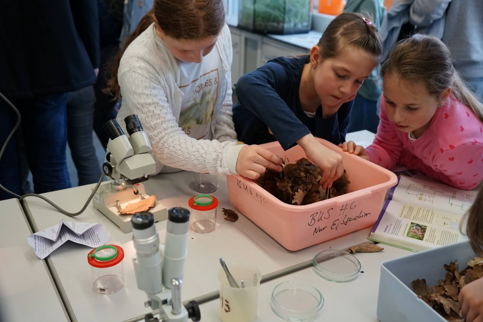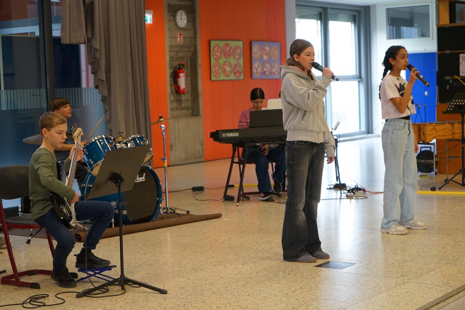 Nach einer ansprechenden Begrüßung durch die Schulband mit „Tau mich auf“ und einem kurzen, informativen Vortrag der Schulleiterin Frau Schwahn begaben sich kleine und große Besucherinnen und Besucher auf Erkundungstour durch das Schulhaus. Es erwarteten sie dort abwechslungsreiche und unterhaltsame Mitmach-und Informationsangebote, präsentiert und entwickelt von zahlreichen engagierten Schülerinnen und Schülern und ihren Lehrerinnen und Lehrern: Im Naturwissenschaftsstrakt konnte man staunend in die „Welt der Physik“ eintauchen, Laubstreu mit dem Binokular untersuchen oder eine beeindruckende feurig-märchenhafte Chemie-Show erleben; in der gemütlich eingerichteten Schulbibliothek waren sprachdetektivische Fähigkeiten gefragt, derweil die Italienischfachschaft mit Eis und Espresso und die Französischfachschaft mit frisch gebackenen Crepes lockte; mathematische Knobeleien sowie spannende Quizaufgaben zu Frankreich, England, Italien und zum alten Rom bereiteten großen Spaß, ebenso das Basteln eines Globus‘, das Balancieren am „heißen Draht“ oder Rollenspiele in der Verkleidung eines römischen Gladiators. Begeisterten Applaus ernteten die Kinder des bilingualen Zugs der 5a, die in beeindruckend flüssigem Englisch drei witzige Theaterstücke zur Aufführung brachten. Wer wollte, konnte sich von freundlichen Schülerlotsen durchs Schulhaus führen lassen oder den Eltern der Schule Fragen stellen und ehrliche Antworten bekommen. Die Eltern der Klassen 6 hatten leckere Kuchen gebacken und Kaffee gekocht und luden damit zum Verweilen ein.