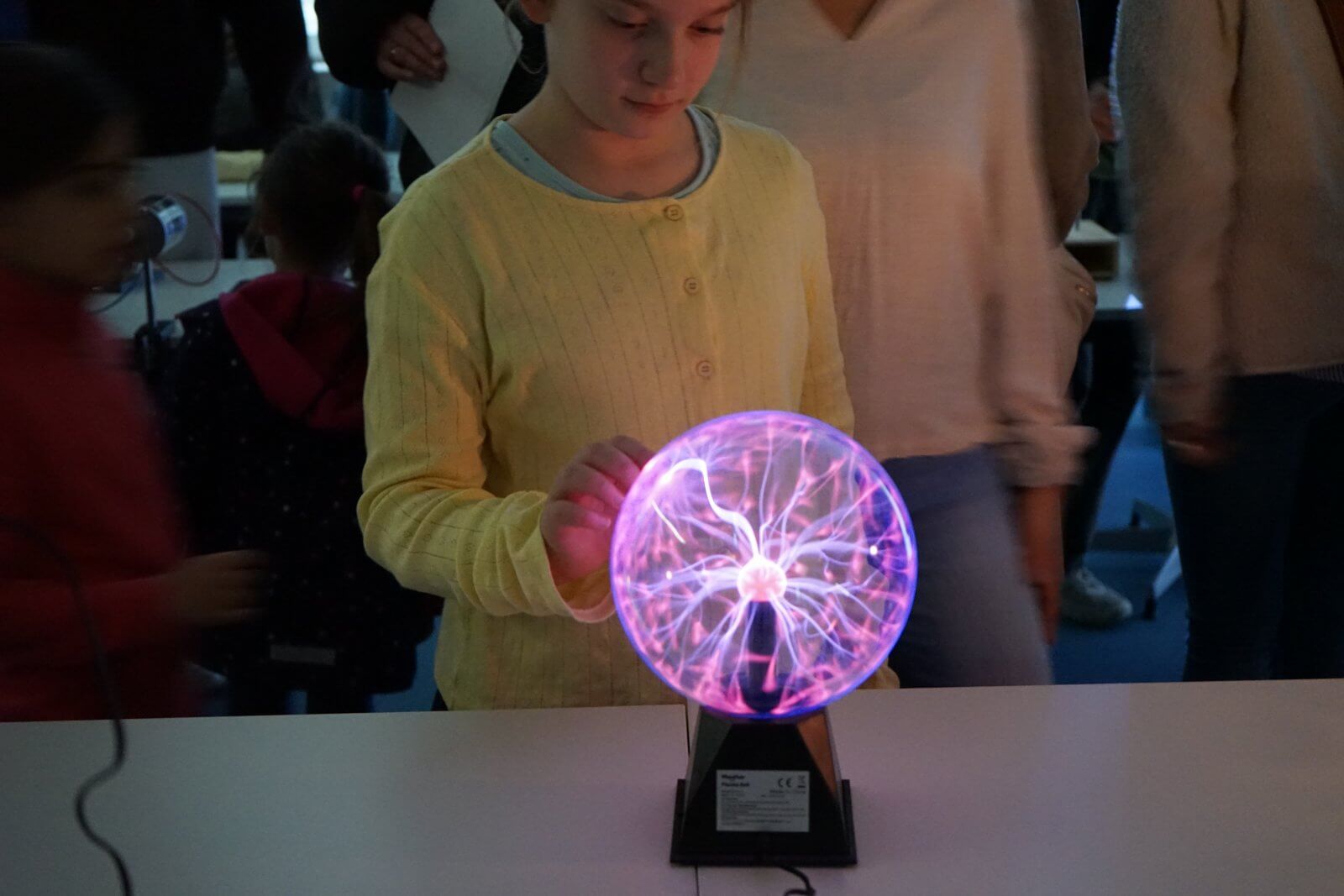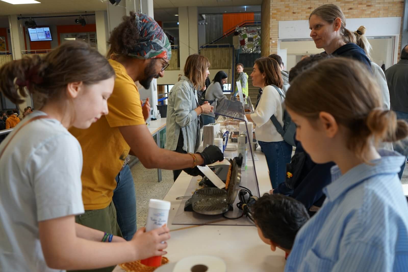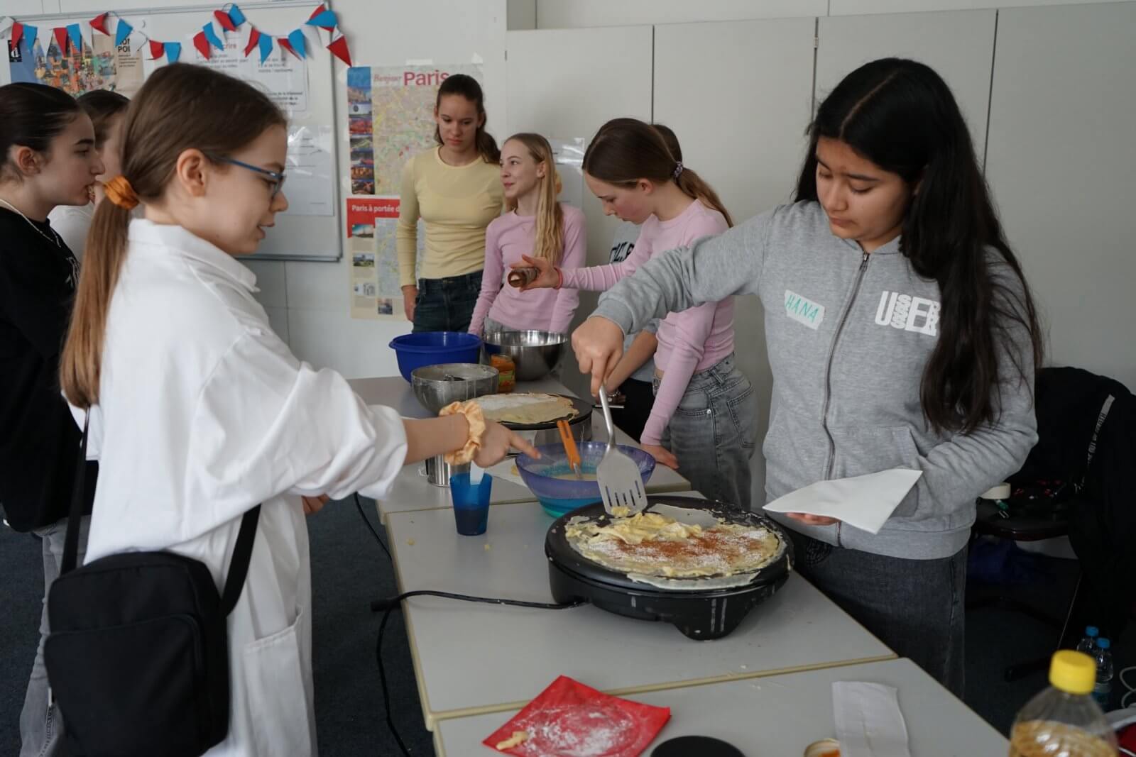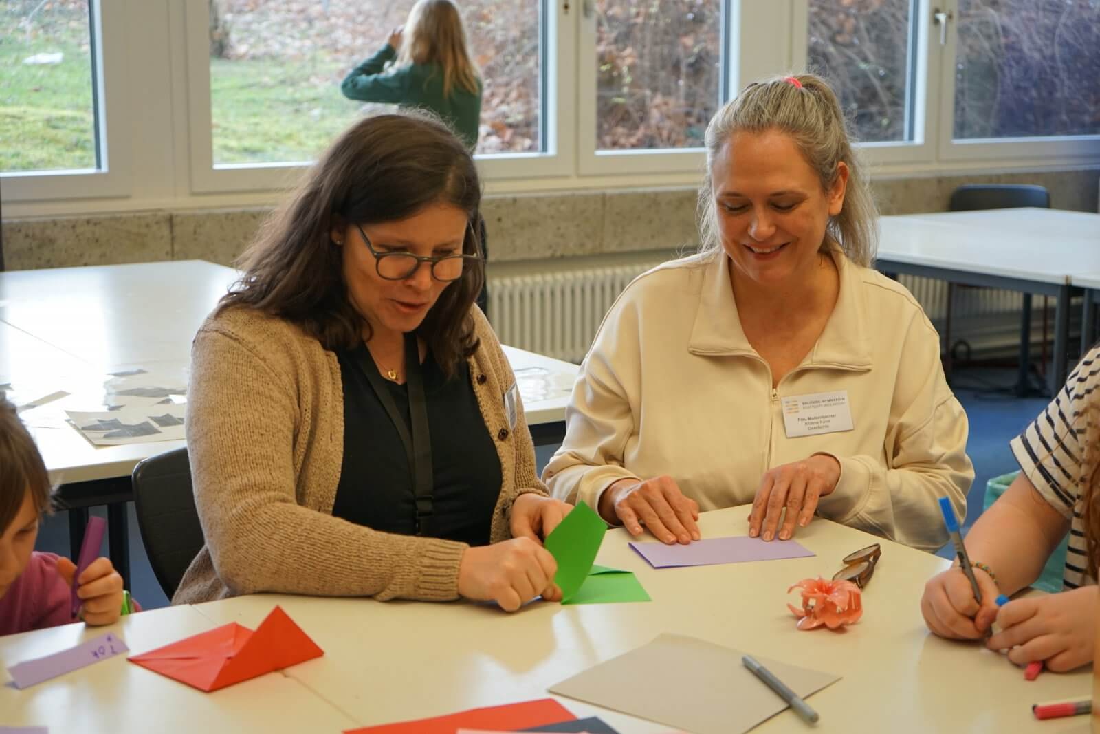Nach einer ansprechenden Begrüßung durch die Schulband mit „Tau mich auf“ und einem kurzen, informativen Vortrag der Schulleiterin Frau Schwahn begaben sich kleine und große Besucherinnen und Besucher auf Erkundungstour durch das Schulhaus. Es erwarteten sie dort abwechslungsreiche und unterhaltsame Mitmach-und Informationsangebote, präsentiert und entwickelt von zahlreichen engagierten Schülerinnen und Schülern und ihren Lehrerinnen und Lehrern: Im Naturwissenschaftsstrakt konnte man staunend in die „Welt der Physik“ eintauchen, Laubstreu mit dem Binokular untersuchen oder eine beeindruckende feurig-märchenhafte Chemie-Show erleben; in der gemütlich eingerichteten Schulbibliothek waren sprachdetektivische Fähigkeiten gefragt, derweil die Italienischfachschaft mit Eis und Espresso und die Französischfachschaft mit frisch gebackenen Crepes lockte; mathematische Knobeleien sowie spannende Quizaufgaben zu Frankreich, England, Italien und zum alten Rom bereiteten großen Spaß, ebenso das Basteln eines Globus‘, das Balancieren am „heißen Draht“ oder Rollenspiele in der Verkleidung eines römischen Gladiators. Begeisterten Applaus ernteten die Kinder des bilingualen Zugs der 5a, die in beeindruckend flüssigem Englisch drei witzige Theaterstücke zur Aufführung brachten. Wer wollte, konnte sich von freundlichen Schülerlotsen durchs Schulhaus führen lassen oder den Eltern der Schule Fragen stellen und ehrliche Antworten bekommen. Die Eltern der Klassen 6 hatten leckere Kuchen gebacken und Kaffee gekocht und luden damit zum Verweilen ein.