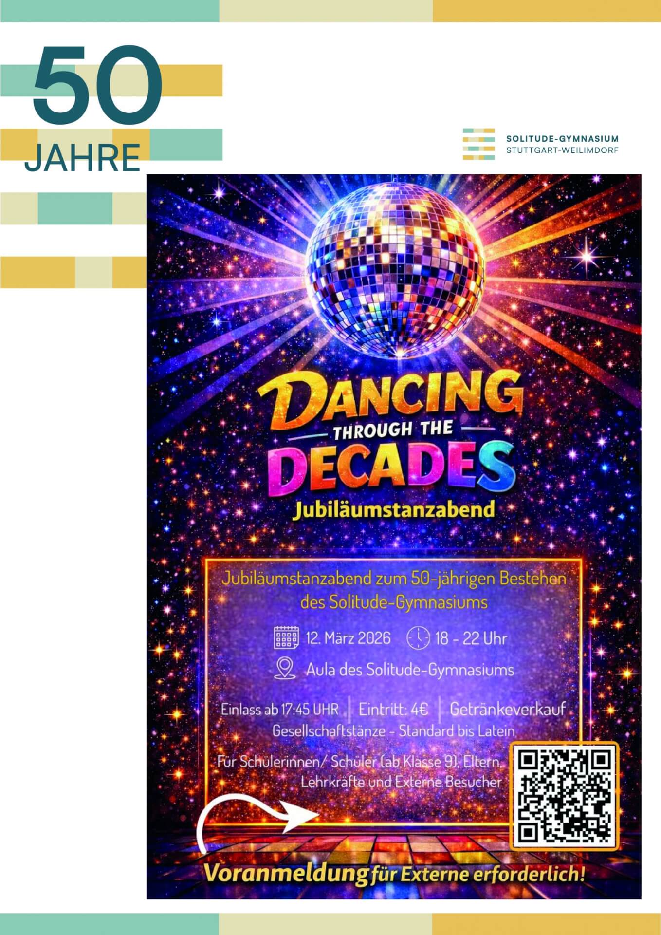 Anlässlich des 50-jährigen Jubiläums lädt das Solitude-Gymnasium am Donnerstag, den 12. März, von 18 bis 22 Uhr zum Jubiläumstanzabend „Dancing through the Decades“ in die Aula des des Solitude-Gymnasiums ein.