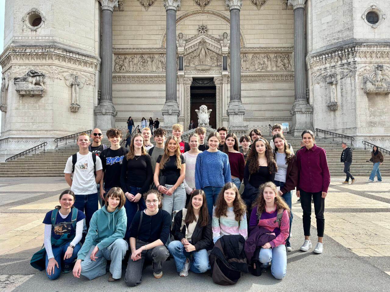 Am Freitag (6.3.) ging es gemeinsam mit den französischen Schülern nach Lyon. Zunächst bekamen wir eine kleine Führung durch die Stadt und liefen dann auf den Fourvière-Hügel hoch, wo wir die berühmte Basilika Notre-Dame de Fourvière besichtigen konnten. Dann ging es weiter zu einem antiken römischen Theater und anschließend hatten wir Freizeit. Wir bummelten durch die Stadt, probierten sehr leckere Macarons und genossen das tolle Wetter. Zeitweise fühlte es sich mehr nach Urlaub als nach einem Schulausflug an.
