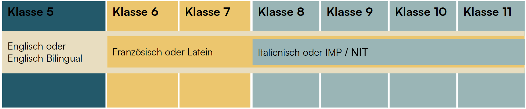 - Im Laufe von Klasse 7 wählen die Schüler das sprachliche Profil mit der 3. Fremdsprache Italienisch oder das naturwissenschaftliche Profil mit dem Fach IMP (Informatik, Mathematik und Physik) als neuem Fach.